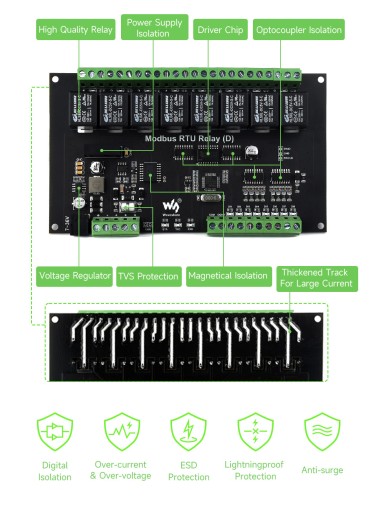 To jest przemysłowy 8-kanałowy moduł przekaźnika kontrolowany za pomocą magistrali RS485, z 8 wejściami cyfrowymi, wykorzystujący protokół Modbus RTU. Posiada wbudowane obwody ochronne, takie jak izolacja zasilania, izolacja magnetyczna, dioda TVS, itp. Jest dostarczany w obudowie ABS. Modbus RTU Relay (D) jest bardzo łatwy w użyciu. Ze względu na szybką komunikację, stabilność, niezawodność i bezpieczeństwo, jest idealnym wyborem do stosowania w sprzęcie do kontroli przemysłowej i/lub aplikacjach o wysokich wymaganiach komunikacyjnych.