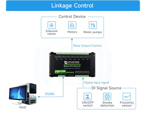 Obsługuje odczyt cyfrowego wejścia poprzez wysyłanie poleceń protokołu Modbus RTU za pośrednictwem magistrali RS485 do sterowania wyjściami przekaźnika.