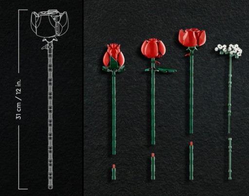 • Najwyższa róża w tym 822-elementowym zestawie ma 31 cm długości
