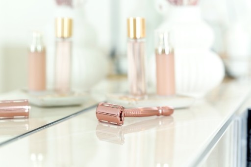 Żyletki do maszynki Wilkinson Sword Intuition Rose Gold w całości zrobionej z metalu w kolorze modnego, różowego złota.
