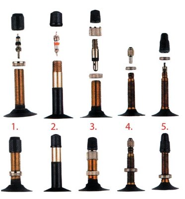 - RV - Ø 6 mm - wentyl stosowany w rowerach pochodzenia włoskiego. Wadą tego systemu jest brak możliwości wymiany samego zaworu w korpusie. Długość: 40 mm. Inne nazwy: Regina, włoski;