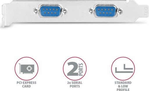 Wyjście: 2x port szeregowy RS-232 ze złączami DB9 male, porty umieszczone wprost na śledziu karty. Gwarantowany przepływ danych wykorzystanych urządzeń RS232 aż 250 kBd. Kompatybilny z 16C550 / Extended 16C550 / 16C950 UART.
