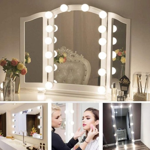 Energooszczędne lampki LED rozświetlą każdą toaletkę! Łatwe w montażu, lekkie i nietłukące lampki ułatwią Ci wykonanie perfekcyjnego makijażu o każdej porze dnia. Nie ważne, czy jesteś profesjonalistką, malujesz się na co dzień czy tylko na specjalne okazje. Komplet 10 lampek LED sprawdzi się doskonale w łazience, sypialni ale także w pokoju dziecięcym, jako dekoracja oraz dodatkowe doświetlenie podczas sesji fotograficznych.