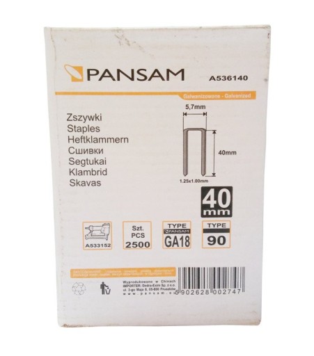 - Zszywki stolarskie TYP 90 dł. 40mm 2500 sztuk.