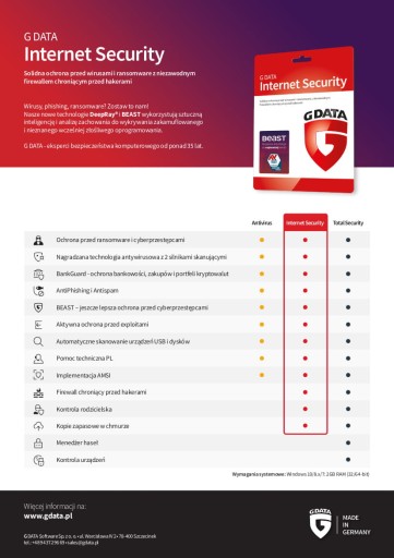 G DATA Internet Security to kompleksowe rozwiązanie łączące zaawansowany antywirus i skuteczną zaporę sieciową . Absolutny must-have w czasach wirusów szyfrujących komputery i wirusów przechwytujących loginy do Banków.