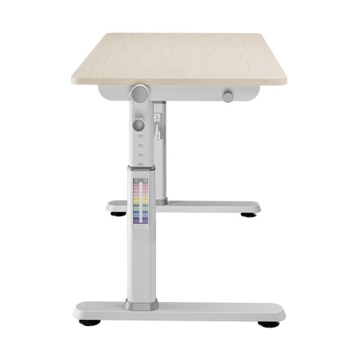 Dzieci mogą łatwo dostosować wysokość biurka do swoich potrzeb, korzystając z lekkiej i płynnej ręcznej korby, która nie jest montowana na stałe - można ją wyjąć zaraz po dostosowaniu wysokości. Wysokość blatu jest regulowana w zakresie od 54 cm do 76 cm. W praktyce to oznacza, że użytkownikiem biurka może być zarówno sześciolatek, jak i uczeń szkoły podstawowej.