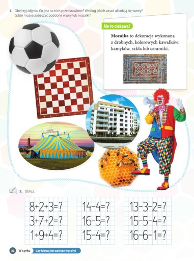 Podręcznik do edukacji matematycznej.Różnorodne ćwiczenia, które się w nim znajdują, aktywizują dzieci, rozbudzają ich ciekawość poznawczą oraz umożliwiają zdobywanie wiedzy i umiejętności odpowiednich dla dzieci w pierwszej klasie szkoły podstawowej.Program Ale to ciekawe zawiera różnorodne elementy, które wzbudzają ciekawość i są dopasowane do potrzeb najmłodszych dzieci w wieku szkolnym.Jednocześnie przekazuje wszystkie niezbędne i zawarte w podstawie programowej treści oraz realizuje przedstawione tam cele kształcenia i wychowania.Wychodząc naprzeciw zmieniającej się rzeczywistości, uwzględniono w książkach nowoczesne formy komunikacji.Pokazują one współczesny świat i nawiązują do otoczenia, także technologicznego, współczesnego człowieka.W każdej klasie przewidziano stałe elementy stymulujące rozwój umysłowy.Zaplanowane zostały tak, aby zwiększający się z czasem poziom trudności zachęcał do działania i umożliwiał odnoszenie kolejnych sukcesów.Podręcznik sprzyja efektywności nauczania poprzez:- różnorodne i ciekawe ćwiczenia, kształtujące wyobraźnię dziecka- trafnie dobrane i atrakcyjne zdjęcia oraz ilustracje- inspirujące zadania matematyczne wprowadzone według zasady: poznaję, ćwiczę, utrwalam, sprawdzam- zagadki matematyczne, które uczą logicznego myślenia i wnioskowania- stałe elementy wzór cyfry pisanej i drukowanej, zegar, linijka, monety, zbiór elementów czy koraliki do liczenia- ujednolicony schemat pozwala łatwiej i szybciej poznawać liczby oraz zrozumieć ich odniesienie do otoczenia- silny akcent położony na manipulację i czynnościowe nauczanie matematyki