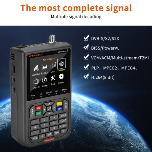 GTMEDIA V8 Finder2 do skanera satelitarnego ze standardami DVB-S/S2 i MPEG-2/4 H.264(8 Bit). Zawiera elementy, które obejmują, interfejs użytkownika, rozszerzone czasowniki pracy na baterie i funkcje zestawu, które obejmują wszystkie funkcje potrzebne do instalacji i monitorowania usług radiowych, bezprzewodowych w domach lub urządzeniach wielorodzinnych.