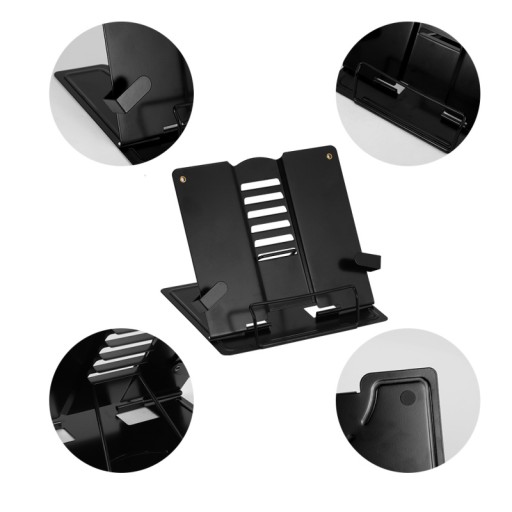 Solidna metalowa półka na książki składa się w zakresie 0-60 stopni i dostosowuje się do sześciu kątów czytania. Może być używany do tabletów, książek kucharskich, podręczników, nut, obrazów, czasopism i innych.