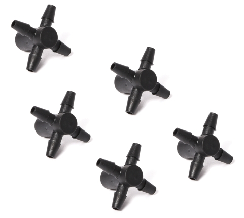 Dwójnik ( zamontowany na wkłuwkę lub kroplownik ) pozwala za pomocą elastycznego wężyka rozgałęzić się na dwa kroplo-spływy zamontowane np. w doniczkach lub na grządkach.