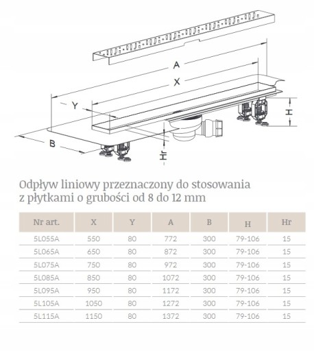 Odpływ liniowy o długości 115 cm przeznaczony do wykończenia płytkami o grubości od 8-12 mm firmy Radaway.
