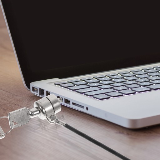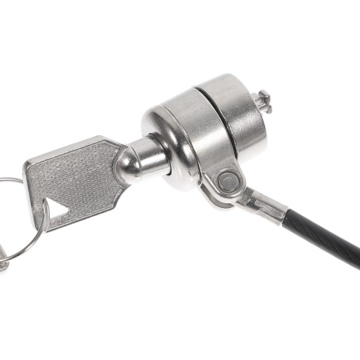 ✅ Przymocuj koniec kabla do przedmiotu, podłącz klucz do zamka laptopa, obróć klucz, aby zablokować laptopa.