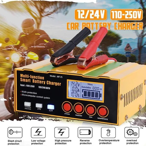 - Inteligentny cyfrowy wyświetlacz LCD. Ładowarka automatycznie rozpoznaje temperaturę na zewnątrz, może / prąd / napięcie / moc / łatwa w obsłudze, inteligentne ładowanie, bez ręcznego ustawienia. Automatyczne ładowanie, gdy bateria jest podłączona do czerwonych przyłączy prądu, aby przymocować dodatnią baterię (+) czarny z zaciskiem do montażu negatywnej baterii (-) transformator wysokiej częstotliwości z czystej miedzi.
