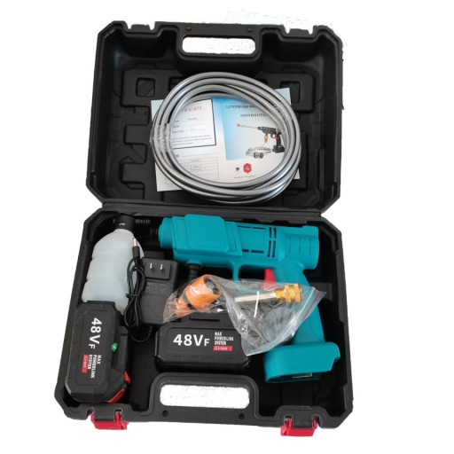 🪣 Pistolet do myjki ciśnieniowej jest wyposażony w akumulator litowy o dużej pojemności 48 V, który nie wymaga kabli i jest łatwy do przenoszenia.