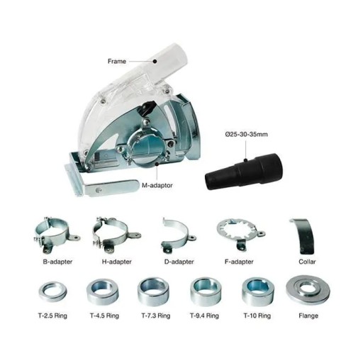- Łatwy Montaż i Demontaż: Kaptur jest przymocowany do szlifierki kątowej za pomocą przejść i pierścieni o średnicy 38 mm - 50 mm, które są zawarte w zestawie. To zapewnia łatwy montaż i demontaż, co jest istotne w przypadku szybkiej zmiany narzędzi.