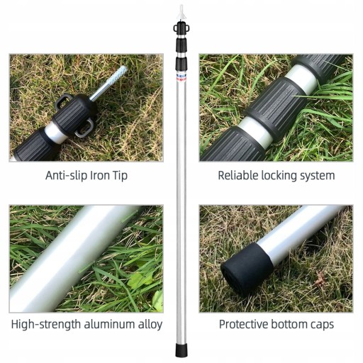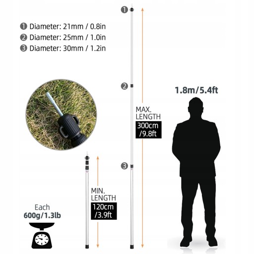 3-sekcyjna konstrukcja z łatwą regulacją od 1,2 m (3,9 stopy) do 3,0 m (9,8 stopy) w celu dopasowania do różnych namiotów.