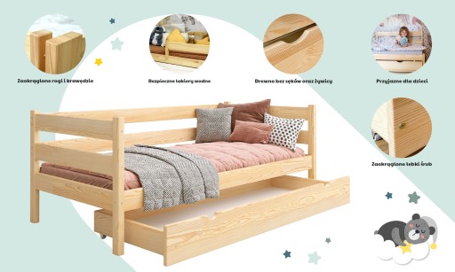 CHARLES to łóżko dla dziecka z barierką wyprodukowane z wysokiej jakości drewna. Drewno sosnowe, z którego wykonano łóżko, zostało wcześniej poddane specjalnej selekcji, a następnie zabezpieczone, w celu wyeliminowania uszkodzeń w postaci pęknięć lub odprysków. Ten model posiada wysokie zagłówki, a także wysoką barierkę umieszczoną na jednym z boków, dzięki czemu gwarantuje bezpieczne użytkowanie łóżka przez najmłodszych.
