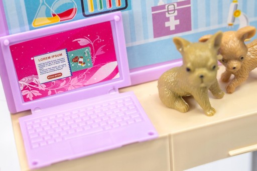 ⭐ Pani weterynarz ubrana w biały lekarski fartuszek z stetoskopem na szyi zbada chore pieski. Badanie wykonana na specjalnym stole, przyda sie do tego m.in. termometr. Wszystko odnotuje w laptopie i zapisze leki. Wykona zastrzyk przy pomocy strzykawki.