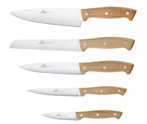 ⭐️ KOMPLET 5 NOŻY Z SYGNOWANYM DREWNIANYM EKO BLOKIEM GERLACH