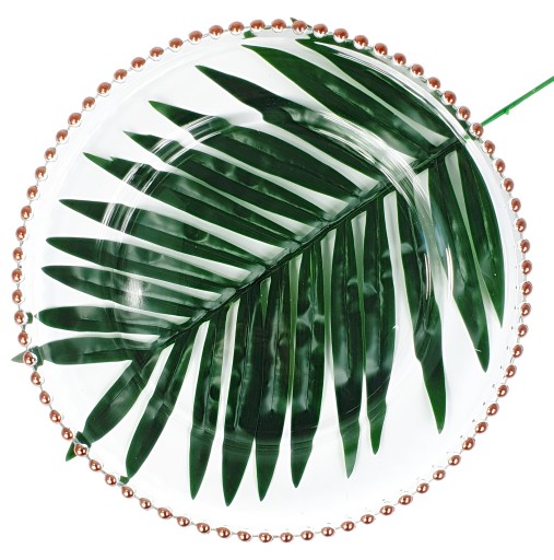 Przezroczysty szklany podtalerz zdobiony jest perełkami w kolorze miedzianym na rantach. Miedzian detale wykończeniowe nadają mu wykwintny i elegancki charakter.