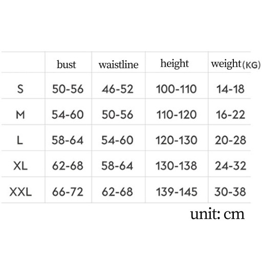 XXL: zalecana wysokość 139 cm-145 cm/54,72 cala-57,09 cala, zalecana waga 30-38 kg, zalecany biust 66 cm-72 cm/25,98 cala-28,35 cala, zalecana talia 62 cm-68 cm/24,41 cala-26,77 cala