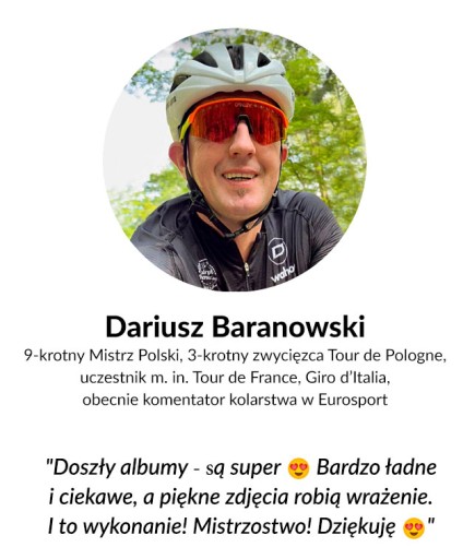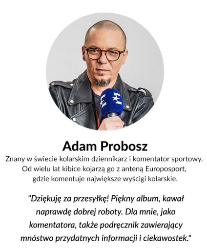 Swoimi przeżyciami płynącymi z rywalizacji na zamieszczonych w albumie podjazdach dzielą się zaś polscy zawodowi kolarze i kolarki: Małgorzata Jasińska, Dariusz Baranowski, Przemysław Niemiec, Bartosz Huzarski, Tomasz Marczyński, Maciej Paterski, Michał Paluta i Marek Rutkiewicz.