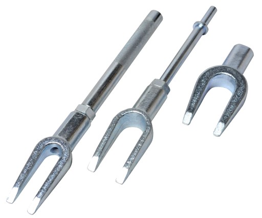 Zestaw ściągaczy widełkowych do drążków kierowniczych i sworzni kulkowych wykonany ze stali chromowo-wanadowej (CrV). Zestaw zawiera trzy ściągacze widełkowe o szerokości wewnętrznej 28, 24, 17 mm oraz dwie rękojeści do dociskania, przystosowane do pracy z młotkiem pneumatycznym lub ręcznym. Ramiona widełek ściągacza posiadają trwałe i równe powierzchnie klinowe pozwalające na łatwe i precyzyjne umocnienie sworzni kulkowych oraz drążków kierowniczych.