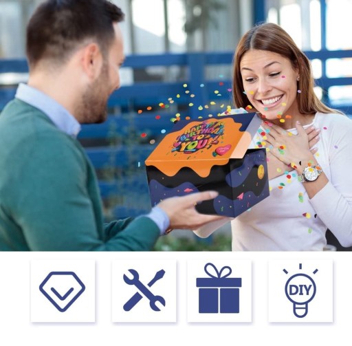 - Dzięki mechanizmowi "wybuchu", pudełko otwiera się efektownie, uwalniając konfetti i dodając radości oraz uśmiechu osobie obdarowanej.