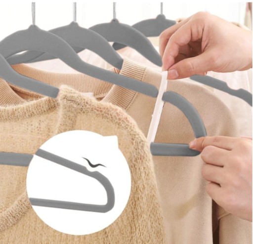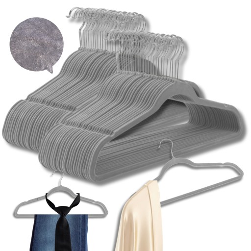 Zestaw 40 szt. wieszaków w kolorze szarym, pokryte aksamitnym welurem zabezpieczą Twoje ubrania przed zsuwaniem się, zaokrąglone ramiona spowodują, że ubrania nie będą się odkształcać. Wieszaki posiadają specjalne wycięcia do zawieszania bluzek/topów na ramiączka. Wykonane z wytrzymałego i cienkiego materiału co pozwoli na zaoszczędzenie miejsca w Twojej szafie! Powiesisz na nich koszule, spodnie, bluzy, kurtki itp.