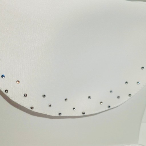 Torebka komunijna uszyta z białej tkaniny ślubnej na sznureczku atłasowym do przewieszenia przez ramię. Torebka jest gładka, klapa torebki ozdobiona kryształami, od środka usztywniana przez co ładnie się prezentuje. Torebka zapinana na rzepa.