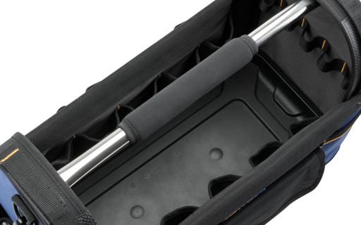 Posiada wyściełaną metalową rączkę i regulowany pasek na ramię ułatwiający przenoszenie narzędzi.