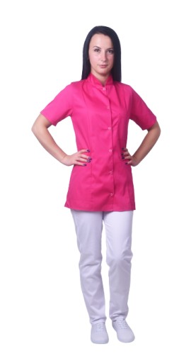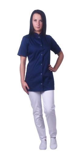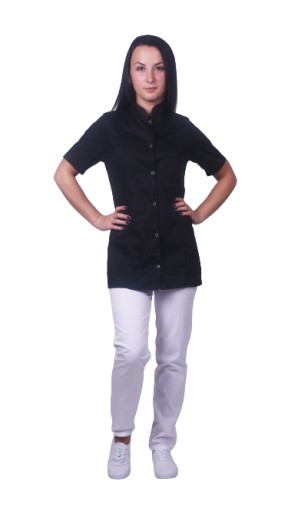 Wysokiej jakości model ze stójką z cięciami dopasowany do sylwetki. Stosowany w służbie zdrowia, salonach kosmetycznych oraz w wielu innych branżach.