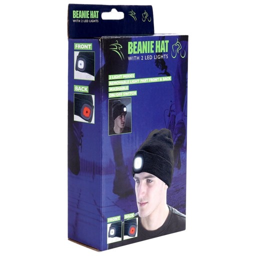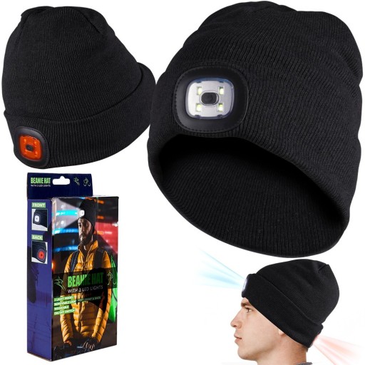 ✅ CIEPŁA - Czapka w kolorze czarnym w stylu beanie wyposażona w dwie lampkami LED umieszczone z przodu oraz tyłu czapki. Czapka o wymiarach 20 x 21 cm.