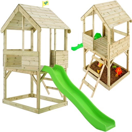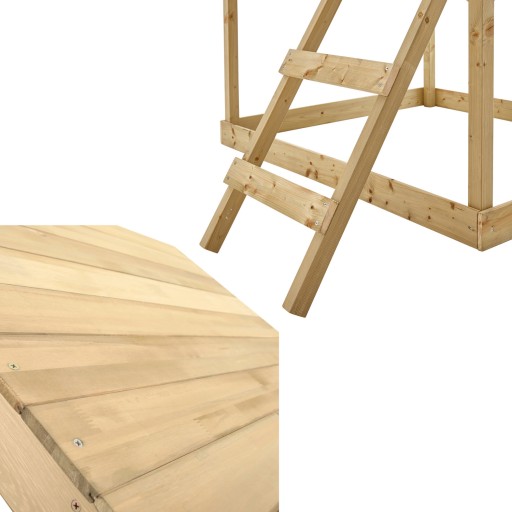Ta urocza, przestronna drewniana wieża na palach stanie się ulubionym miejscem do zabawy i spędzania czasu na świeżym powietrzu. Domek został wykonany z naturalnego, certyfikowanego drewna FSC, co nadaje mu rustykalny i przytulny wygląd. Domek jest przestronny i wygodny a podłoga wyłożona jest wytrzymałymi deskami. Maksymalna łączna waga użytkowników domku to 150kg. Dzięki temu dzieci będą miały duże, mocne, wygodne i bezpieczne miejsce do zabawy.