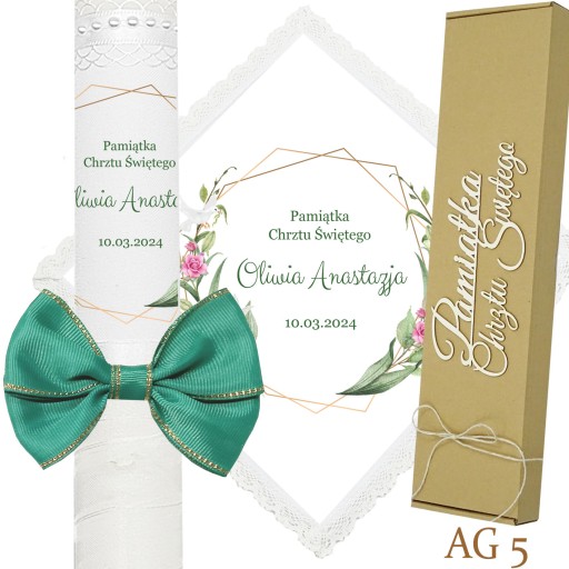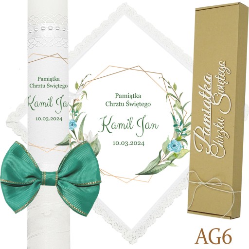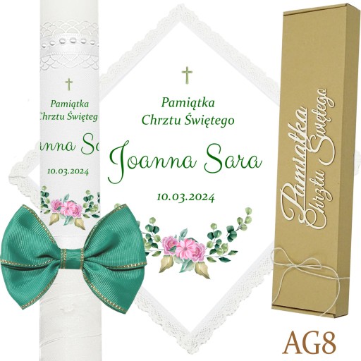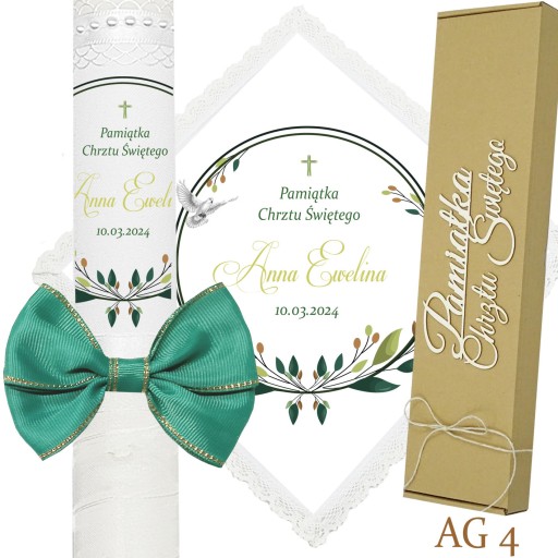 Wszystko to zapakowane jest w kartonowe eco pudełko z 3D napisem „Pamiątka Chrztu Świętego” Ten wyjątkowy zestaw szatki i świecy z pewnością podkreśli uroczystość chrztu.