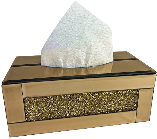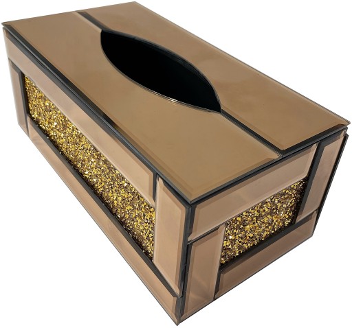 Pudełko na chusteczki z kryształami. Dno pojemnika jest plastikowe, a środek welurowy.