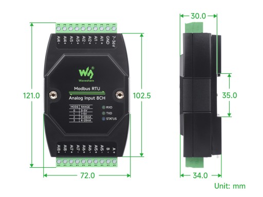 Przemysłowy moduł akwizycji analogowej o 8 kanałach, 12-bitowy, wysokiej precyzji, obsługujący akwizycję napięcia i prądu, z szerokim zakresem zasilania od 7 do 36V DC oraz protokołem Modbus RTU.