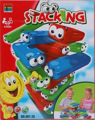Jenga to gra zręcznościowa złożona z 30 długich elementów o wymiarach 9,5 x 4,5 x 2,5 cm z twarzą z wyłupiastymi oczami w trzech kolorach (zielonym, czerwonym i niebieskim), która polega na zbudowaniu wieży poprzez ułożenie bloków poprzecznie na przemiennie. Usuwając bloki jeden po drugim i kładąc na wierzchu, kontynuujemy zabawę do momentu, aż wieża runie. Gracz, który wykonał ruch przed graczem, który spowodował upadek wieży, wygrywa.