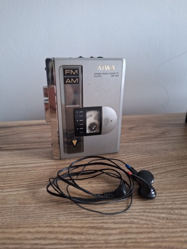 Walkman Aiwa HS T23, sprawny (sprawdzony na kasecie 60), odtwarza i przewija kasetę, radio ładnie odbiera stacje. Solidnie wykonany model, z metalowymi elementami w kieszeni na kasetę. Gratis słuchawki widoczne na zdjęciu.