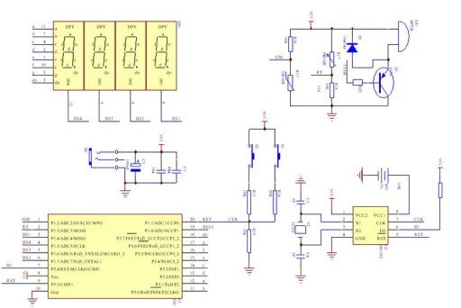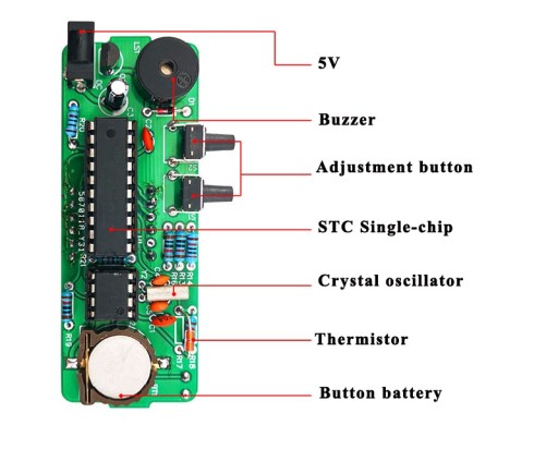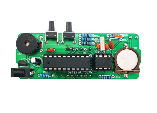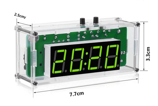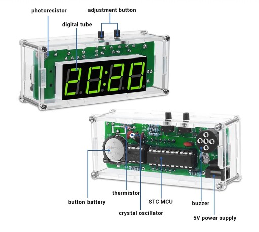 Cyfrowy zegar sterowany poprzez pojedynczy układ scalony STC wykorzystuje specjalny układ DS1302, pamięć ustawień dzięki baterii CR1220