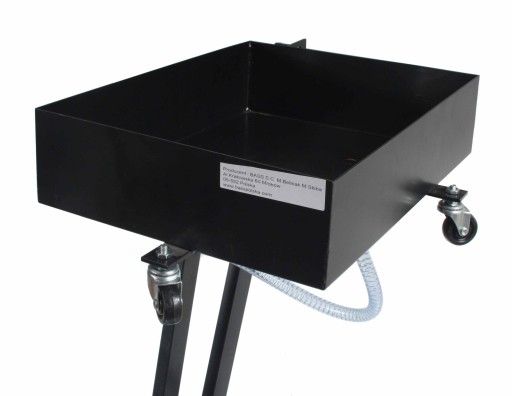 - Centralnie umiejscowiony pojemnik na olej o regulowanej wysokości ułatwia dostosowanie położenia kurka spustowego i wysokości podnośnika. Zawór znajdujący się pod pojemnikiem umożliwia szybkie oględziny przepracowanego oleju przed odprowadzeniem go do zbiornika. W celu ułatwienia manewrowania pojemnikiem, został on wyposażony w trzy obrotowe kółka.