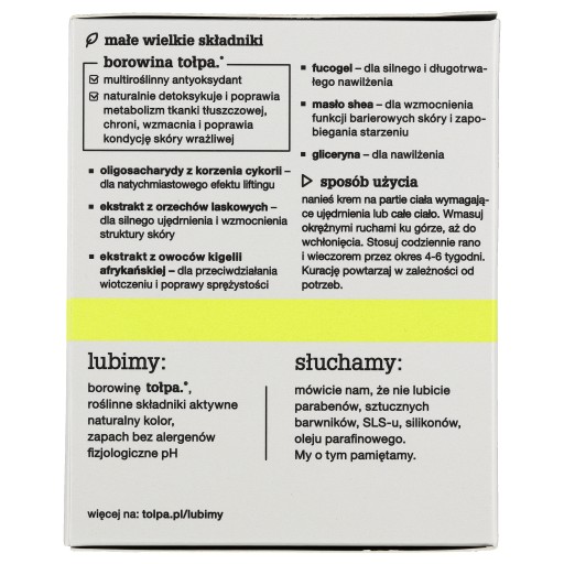 Produkt jest skoncentrowany i łączy w sobie aż 5 funkcji: 1 silnie ujędrnia 2 odżywia 3 nawilża skórę 4 zapobiega starzeniu 5 chroni przed rozstępami. Wzmacnia strukturę skóry, poprawia jej elastyczność o 14% i zwiększa wytrzymałość na rozciąganie. Dzięki temu zapobiega powstawaniu rozstępów i ogranicza powierzchnię już istniejących. Liftinguje i zapobiega wiotczeniu. Zwiększa nawilżenie o 16% i utrzymuje na wysokim poziomie do 24 h. Stymuluje skórę do odnowy, odżywia, regeneruje i spowalnia jej starzenie. Dzięki zawartości borowiny tołpa.® działa detoksykująco. Ma konsystencję puszystego kremu i natychmiast po użyciu wygładza i napina skórę pozostawiając komfort.