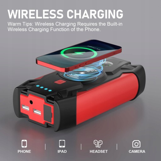 - Jump Starter ma funkcję ładowania bezprzewodowego, która może uwolnić urządzenia elektroniczne z kajdan kabel USB (inteligentne urządzenia muszą obsługiwać ładowanie bezprzewodowe)