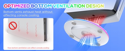 【Struktura zapewniająca lepsze odprowadzanie ciepła】 Otwory wentylacyjne na dole nie zapobiegają rozpraszaniu ciepła przez konsolę. Jeśli graczom nie podoba się oświetlenie, mogą odłączyć kable USB i używać go wyłącznie jako prostego stojaka.