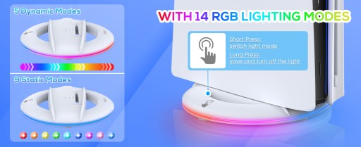 【14 trybów oświetlenia do wyboru】Dzięki 9 trybom monochromatycznym i 5 trybom dynamicznym do wyboru gracze mogą stworzyć niepowtarzalną atmosferę w grze za pomocą pionowej diody LED na stojaku ps5 slim. Krótkie dotknięcie, aby zmienić tryb lub wyłączyć światło. Długie dotknięcie, aby wyłączyć światło.