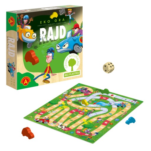 Któż nie marzy o tym by choćby obejrzeć samochodowe rajdy. Już dziś każdy z Was może wziąć udział w wyścigu samochodowym. Dzięki ekologicznej planszowej grze Rajd na torze wyścigowym mogą nas czekać liczne przygody. Czy kot przebiegnie, czy stanie krowa, a może złapiemy kapcia lub odmówi posłuszeństwa silnik? Droga nie będzie łatwa, ale za to w przeciwieństwie do jazdy ta polska gra będzie w pełni bezpieczna. Ta polska zabawka z kolekcji GRAMY NATURALNIE - BEZ PLASTIKU pomyślana została z dbałości o środowisko naturalne. Drewniana kostka i pionki w kształcie samochodów powstały ze specjalnie wybranego drewna. Pozbawione folii opakowanie. W myśl znanego powiedzenia: „Czym skorupka za młodu…” chcemy uczyć od najmłodszych lat, że należy dbać o środowisko naturalne. Zasiądźmy więc przed rodzinną grą typu wyścig, w której spróbujemy jak najszybciej dotrzeć do mety.