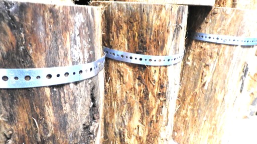 Pieniek owinięty i zabezpieczony grubą stalową taśmą która wpływa na bezpieczniejszą pracę(podczas bezpośredniego uderzenia w pieniek taśma zabezpieczy go przed rozłupaniem )