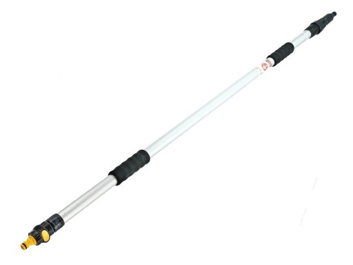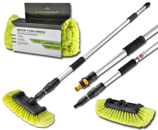 Szczotka jest przepływowa - oznacza to, że na górze kija znajduje się zawór do którego podłączamy wąż z wodą, która przepływa przez cały uchwyt i zostaje rozprowadzona szczotką na końcu.