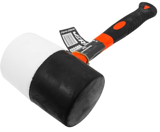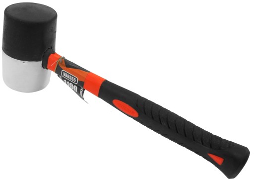 Obuch okrągły wykonany w połowie z czarnej i białej gumy (użyte gumy o różnych twardościach). Osadzony na trzonku z włókien szklanych (fiberglass)/ osłoniętym nakładkami antypoślizgowymi. . Młotek gumowy do prac montażowych w wielu branżach. Szczególnie przydatny przy układaniu glazury, montażach mebli i innych pracach z delikatnymi materiałami. Biała guma nie pozostawia śladów na materiale. Odporny na wpływ wilgoci. Waga 1100 gram.