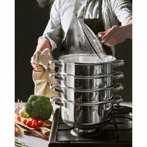Każdy z pięciu elementów zestawu posiada ergonomiczną, stalową rączkę. Co więcej, budowa zaprezentowanego garnka do gotowania na parze umożliwia konsumentom czyszczenie go w domowej zmywarce.